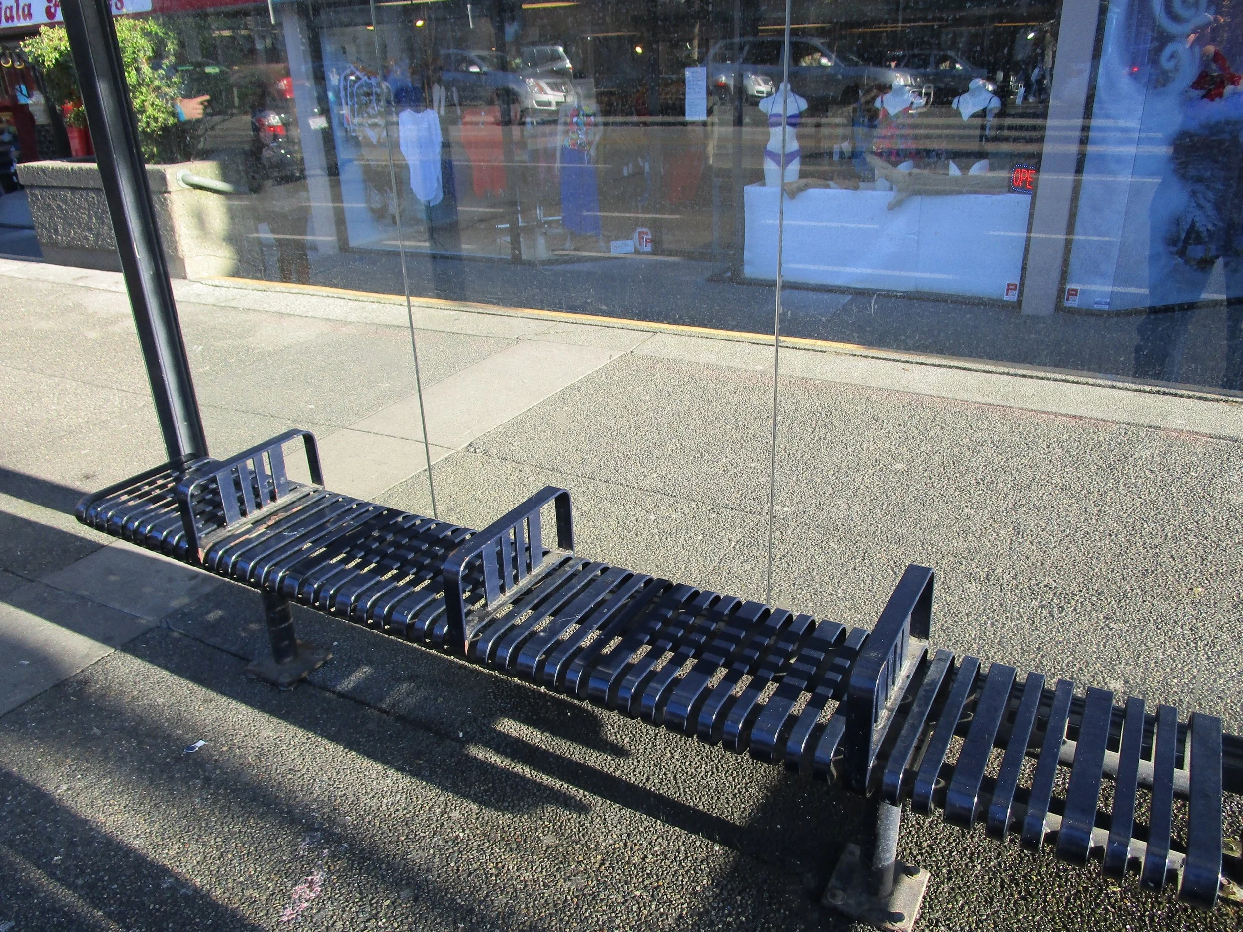 Benches aren’t likely to be anyone’s first choice for a bed, but barred armrests stop anyone from even trying to use the benches as a place to sleep off the ground. Benches in Douglas Street bus shelters, which might otherwise provide dry sleeping locations, also include barred armrests. The Hamilton Spectator reports that “Manufacturers that sell public seating with centre arm rests sometimes call them ‘anti-vagrant benches.’” Whether or not homeless Victorians would choose to sleep on the Douglas Street benches, the armrests are designed to remove that choice.